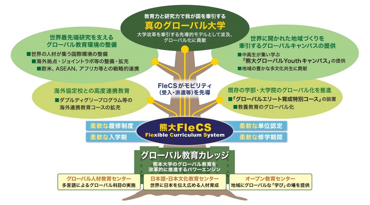 熊本大学は、平成26年度文部科学省スーパーグローバル大学等事業「スーパーグローバル大学創成支援」に採択されました。本学が事業の構想名に掲げる「地域と世界をつなぐグローバル大学Kumamoto」は、真のグローバル大学への変貌を目指し、以下の4つの大目標を掲げ、地域のグローバル化を牽引するとともに世界レベルの研究拠点大学としての地位を確立することを目的としています。