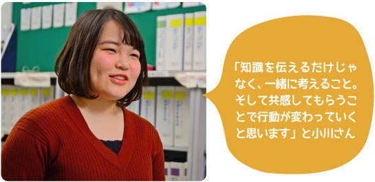 くまぴあに入部した理由について、小川さんは、「大学生になって、ボランティア的な活動に参加したいと思っていたから」。同時に、ほかにも2つのサークルに入りましたが、今はくまぴあをメインにしているそう。「私自身も悩んだ思春期にいる中高生と触れ合うピアの活動に魅力を感じたからです。くまぴあは性とコミュニケーションとライフプランという3つが柱と言いましたが、性感染症予防なら、性教育だけでなく、コミュニケーションも大事だし、将来こういう生き方がしたいなら、今これはやっても、あれはしない、といったようなライフプランも大事。3つは密接にかかわっていて切り離せないことを学び、より活動に魅力を感じたことが、現在くまぴあメインで活動している理由です」。井上さんも、入部した理由は、小川さんと同じく「ボランティア的な活動を経験したかったこと」。さらに、「将来保健師になりたいと考えて保健学科に進学したんです。保健師の仕事には啓発活動もあるので、そんな経験が大学生のうちにできればと思いました」と話します。「くまぴあの活動は、大切なことを人に伝えるというだけでなく、自分の生き方についても考えることができるものです。来年度の新入生にもたくさん入部してもらって、みんなと一緒にやってきたいと思います」。