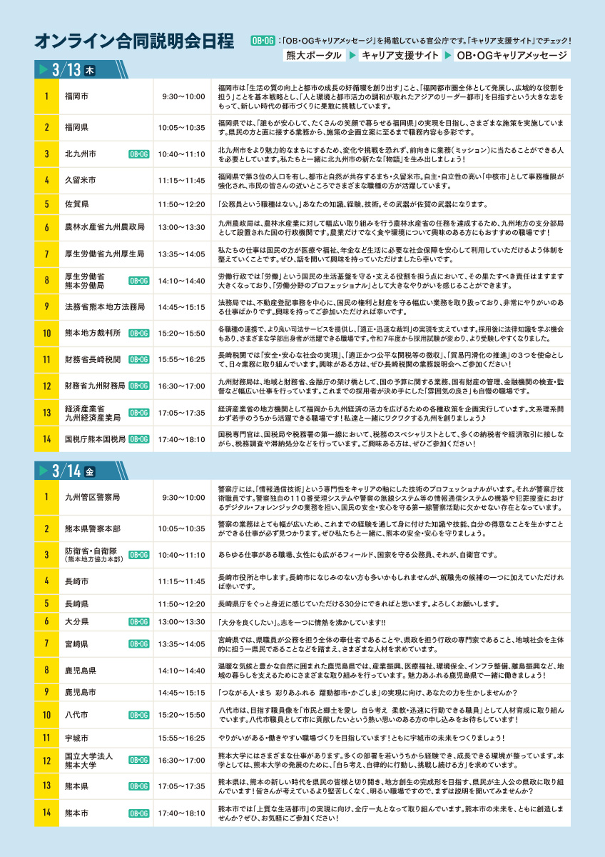 企業の採用情報が解禁される3月に、約120社の企業が熊本大学の学生向けに説明会を実施します。オンラインで文系、理系の両方を採用予定の優良企業の会社説明会に参加することができます。熊大生採用に意欲的な東京、大阪、九州、熊本等の優良企業と効率よくコミュニケーションがとれることで学生にも好評を得ています。