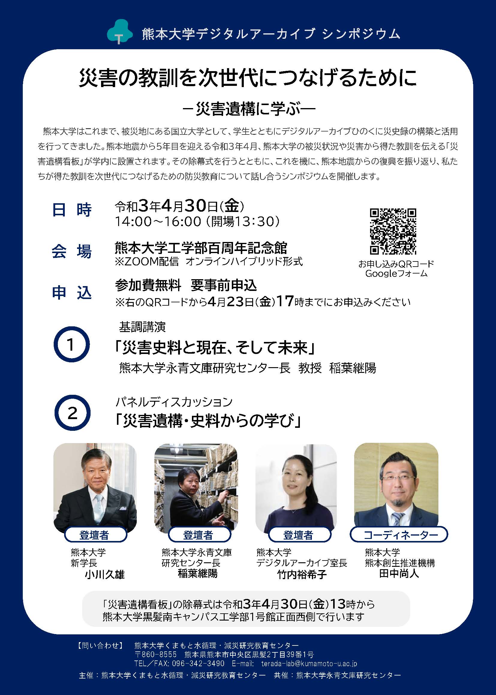 | 日時・場所 | 令和3年4月30日(金) 災害遺構看板除幕式 13:00~13:15 熊本大学工学部1号館前 シンポジウム 14:00~16:00 熊本大学工学部百周年記念館 |