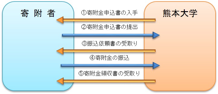 本学へ寄附をされる場合はページ下部の 各部局受入担当部署 へ「 寄附金申込書 」(Word 14KB)をご提出ください。