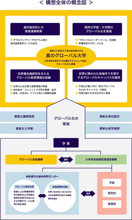 熊本大学は平成26年度文部科学省スーパーグローバル大学等事業「スーパーグローバル大学創成支援」において牽引型24大学の一つに採択されました。本学が掲げる「地域と世界をつなぐグローバル大学Kumamoto」は、真のグローバル大学への変貌を目指し、世界トップランクの大学と伍する研究拠点大学としての位置を確立する事を目的とした教育改革を基盤としています。