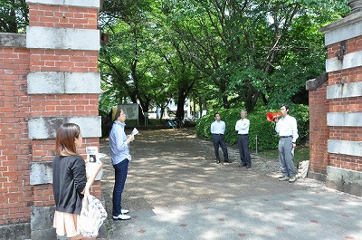 5月20日(月)~22日(水)は黒髪キャンパス北地区に見学コースを設け、赤門(集合)→附属図書館南棟→くすのき会館→五高記念館→武夫原グラウンド→文化部サークル棟の順で歩きました。図書館南棟の下にはかつて奈良・平安時代の重要な遺跡があり、文化部サークル棟の下では学内でも古い時期に相当する縄文土器(約9,000~8,000年前)が出土しています。