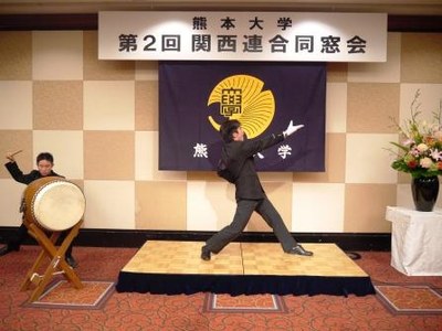 会場には熊本県産の日本酒、焼酎が持ち込まれ、磯田淳熊本県大阪事務所次長(昭和58年法文学部卒業)から熊本県のアピールも行われました。会の最後には、現役学生で体育会応援団第38代団長の山根元気さん(理学部4年次)より、本学同窓生らに歌い継がれてきた『五髙寮歌』と “巻頭言”が朗々と放歌されました。(太鼓は応援団員の谷雄飛さん(理学部1年次))