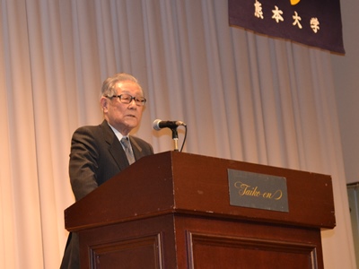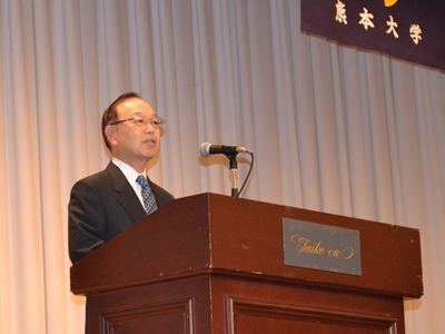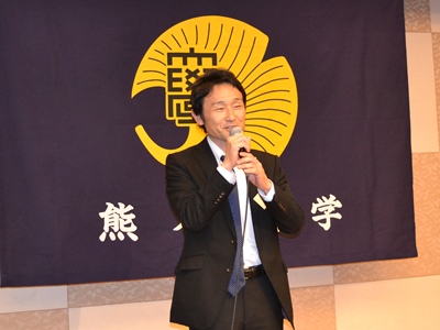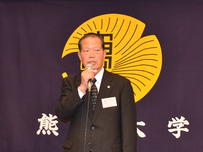 谷口学長からは、熊本大学が全国の国公私立大学から22機関のみが採択される文部科学省研究大学強化促進事業に採択されたことや熊本大学を象徴的に表す言葉として「創造する森 挑戦する炎」を策定したことなど、大学の近況について報告があり、生命系・自然系・人文社会系を有する総合大学として、研究・教育・国際化を更に推進し平成の五高となる旨の力強いメッセージが発せられました。