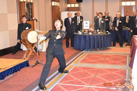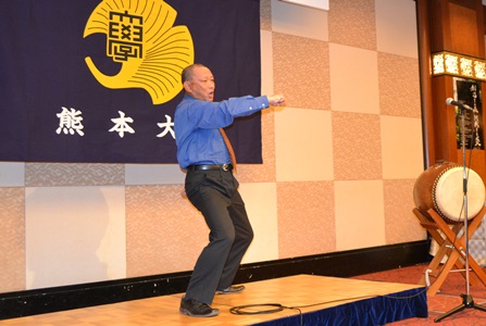 会の終盤では、川上伸二熊本県大阪事務所次長(昭和61年法学部卒)からの挨拶の後、引き続き、体育会応援団の西本徹さん(第41代応援団団長、理学部2年次)と山口昌哉さん(法学部1年次)から、“巻頭言”及び“五髙寮歌”が披露され、五高スピリットである「剛毅木訥(ごうきぼくとつ)(理想を高く、志を強く、そして素朴であれ)」の精神の下、参加者は手拍子を打ちながら盛大に合唱しました。