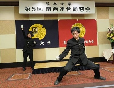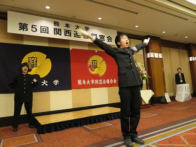 また、会の中では、体育会応援団の西本徹氏(第43代応援団団長、理学部4年)及び中村あゆみ氏(理学部1年)による“巻頭言”と“五高寮歌”が披露されました。