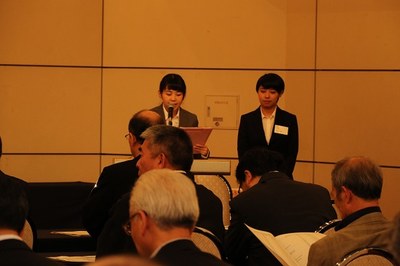 当日は、放送部の宮川美幸氏(放送部、法学部3年)と芹口いつみ氏(放送部、文学部2年)の司会進行の下、総会が行われ、安田宏正会長(武夫原会理事、昭和42年法文学部卒)、二塚信熊本大学同窓会連合会会長(熊杏会会長、昭和39年医学部卒)からの挨拶のほか、役員等紹介が行われました。