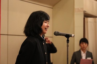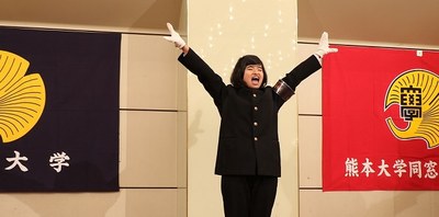 交流会の終盤では、体育会応援団の中村あゆみ氏(応援団リーダー部第44代団長、理学部2年)による“巻頭言”と“五高寮歌”が披露され、参加者による合唱が高らかに会場に響き渡りました。