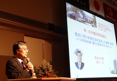 講演会では、谷口学長から『歴史に学び未来社会を志向した教育・研究=100年後も輝く憧れの熊本大学に向けて=』と題した基調講演が行われ、前身となる再春館から数えて258年となる熊本大学の歴史、学習から学修へと質の転換を図る教育、文部科学省に拠点として選ばれた研究、めざましい活躍を見せる学生の課外活動など、多岐にわたる大学の取組が報告されました。