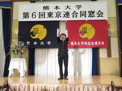 その後、熊本県東京事務所の宮本真由美氏(平成3年法学部卒)からの熊本県の活動紹介のほか、体育会応援団の西本徹氏(応援団リーダー部第41代団長、理学部3年)による“巻頭言”と“五髙寮歌”が披露されました。