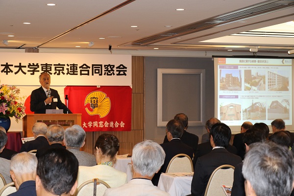 講演会では、原田信志学長から「熊本地震後の熊本大学キャンパスの整備計画~五高記念館を中心として~」と題した基調講演、熊本市経済観光局熊本城総合事務所城戸秀一様から「熊本城の地震被害と復旧状況について」と題した特別講演、松本理事から「同窓生の皆様方へのお願い」として講演が行われました。