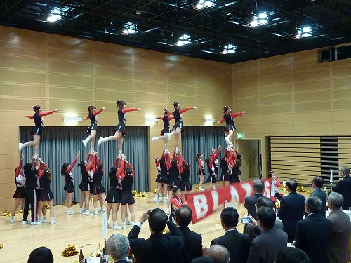 パーティーの合間には、現役学生による研究発表、吹奏楽やマンドリンの演奏、ジャグリング、チアリーディングなどをご覧いただき、爽やかで活気が感じられたと好評でした。