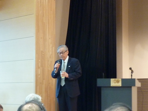 パーティの冒頭には、本学同窓会連合会の岡村 宏会長のご挨拶のあと、本学に顕著な功績等を残された卒業生表彰者並びに名誉フェロー授与者のご紹介をさせていただきました。続いて学長の谷口 功から、 本学の近況と国立大学の新たな役割 (PDF 2.84MB)について、ご報告申し上げました。