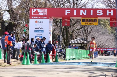 平成30年2月18日(日)に開催されました「熊本城マラソン2018」において、本学教育学部3年の古川大晃(フルカワ ヒロアキ)さんが、「歴史めぐりフルマラソン(男子)」において2時間20分50秒で見事初優勝を果たしました。