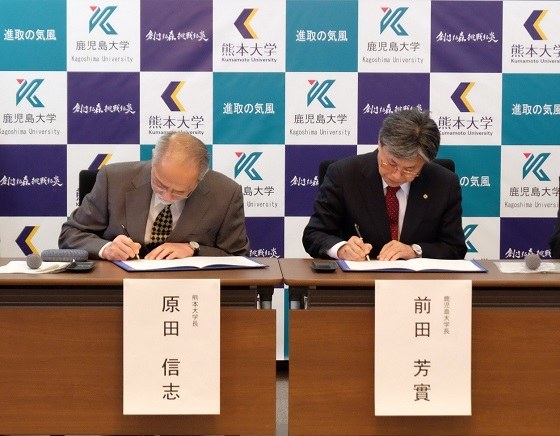 協定書締結式では、原田信志熊本大学長と前田芳實鹿児島大学長が協定書に署名し、新センターの編成や運営に関する重要事項について、確認しました。